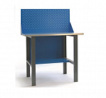Верстак комплектуется полкой-стенкой, расположенной под столешницей для удобного размещения габаритного инструмента и оснастки. Опорные элементы выполнены сварными из холоднокатаной стали. Все металлические элементы покрыты полиэфирной порошковой краской. Столешница из фанеры толщиной 24 мм, которая покрыта листом оцинкованной стали толщиной 1,2 мм. Глубина столешниц 696 мм. Максимальная масса груза на столешнице - 350 кг.