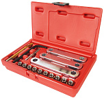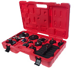 Адаптеры с положительной и отрицательной резьбой для различных моделей предупреждают повреждение поршней и сальников. Имеет два привода с правосторонней и левосторонней резьбой для различных марок автомобилей. Общее количество предметов в комплекте: 21 шт.