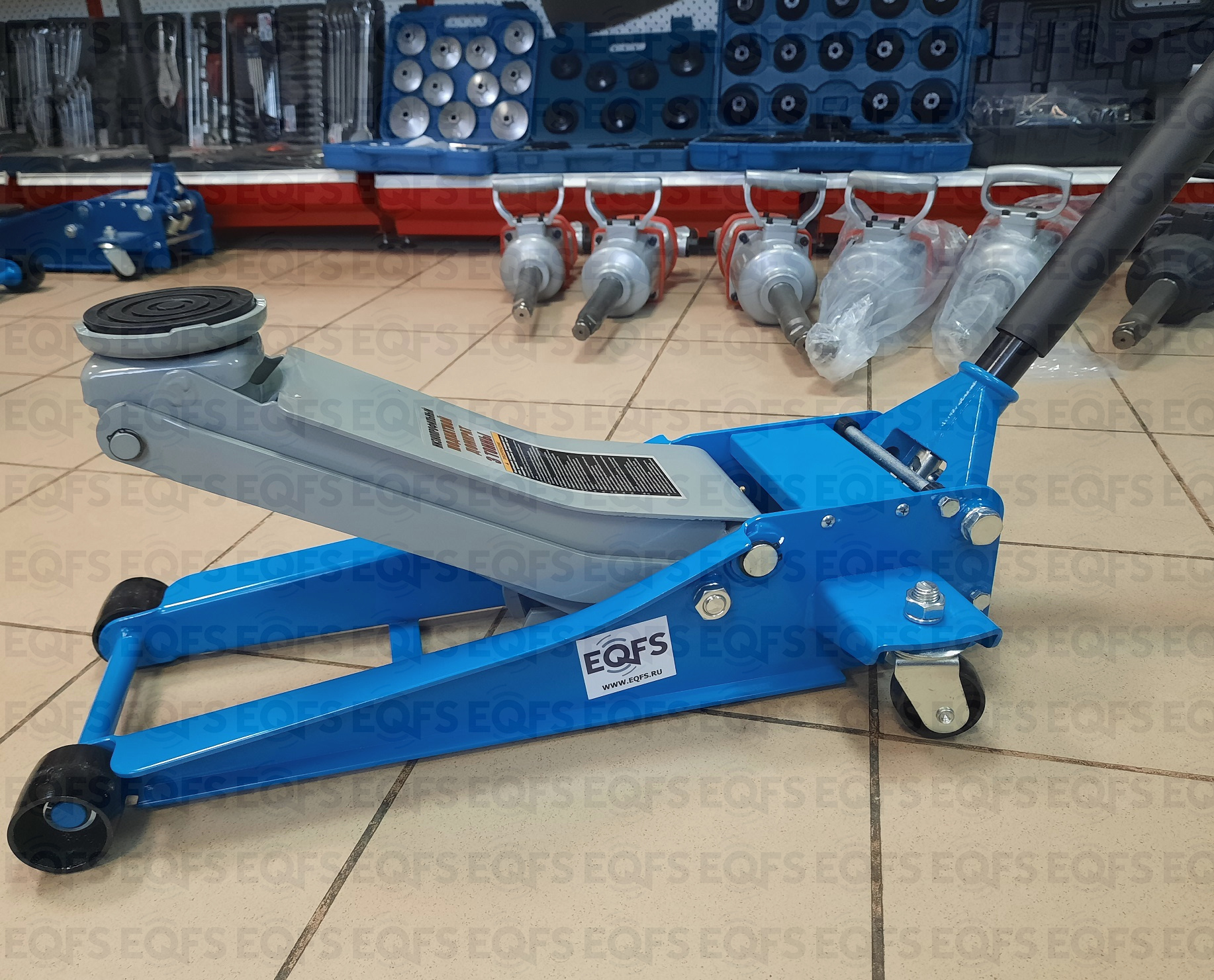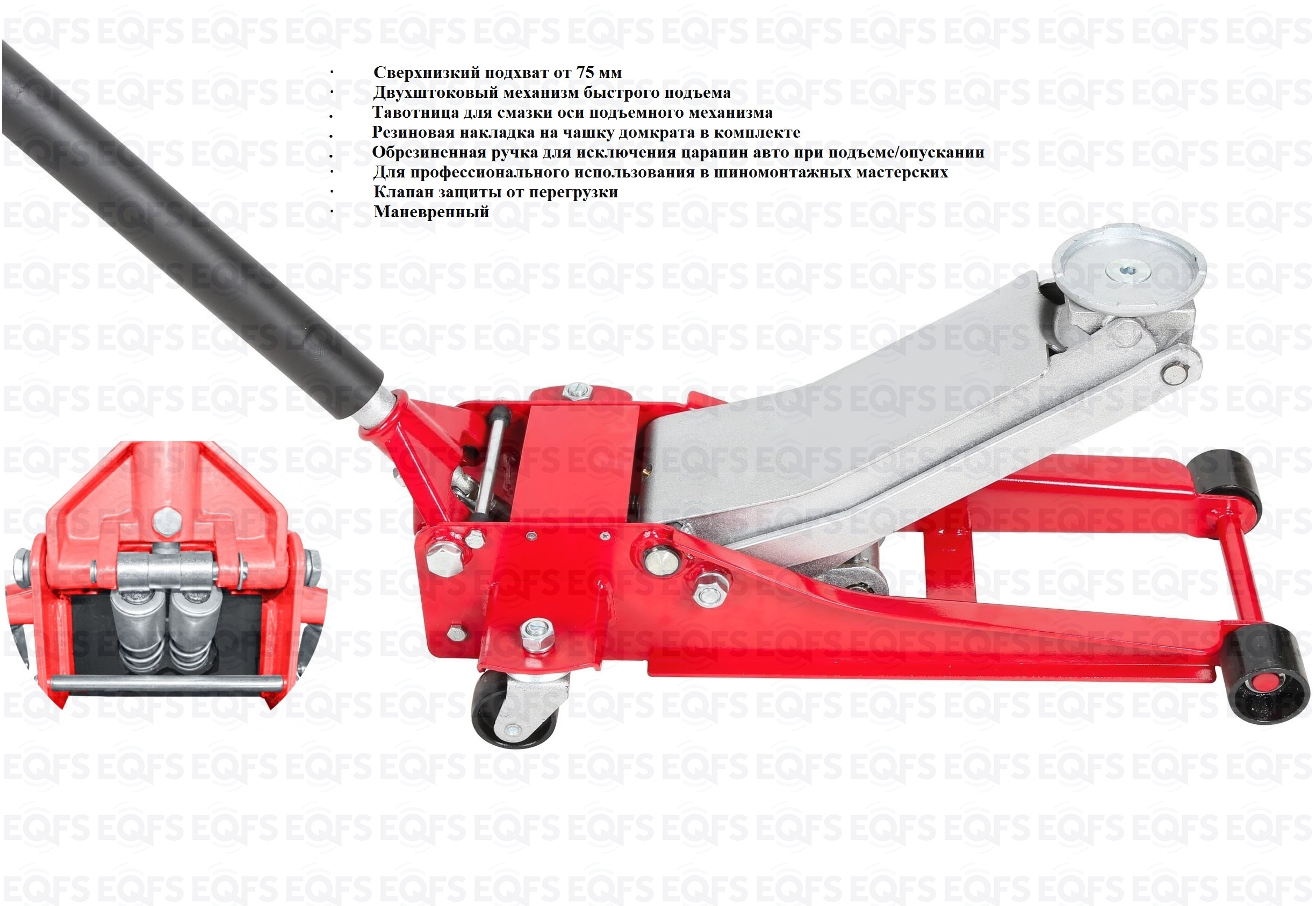 Для профессионалов. Низкопрофильный. Подкатной. Двухштоковый механизм с усиленной конструкцией. Быстрый подъем. С тавотницей. Для применения в шиномонтажных мастерских и автосервисах для поднятия автомобилей с низким клиренсом.  г/п 3 тонны. Высота подъема мин / макс - 75-505 мм. Масса 34 кг.