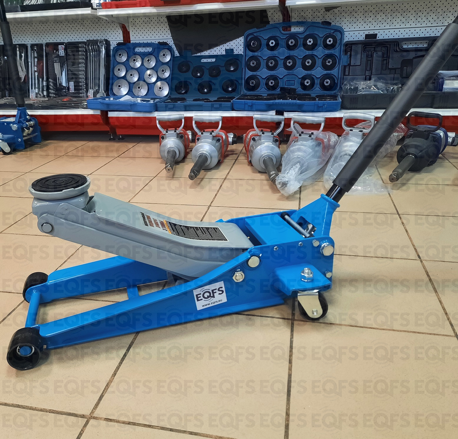 Домкрат подкатной low profile рекомендуется к применению в шиномонтажных мастерских и автосервисах для поднятия автомобилей с низким клиренсом. Цвет темно-синий.