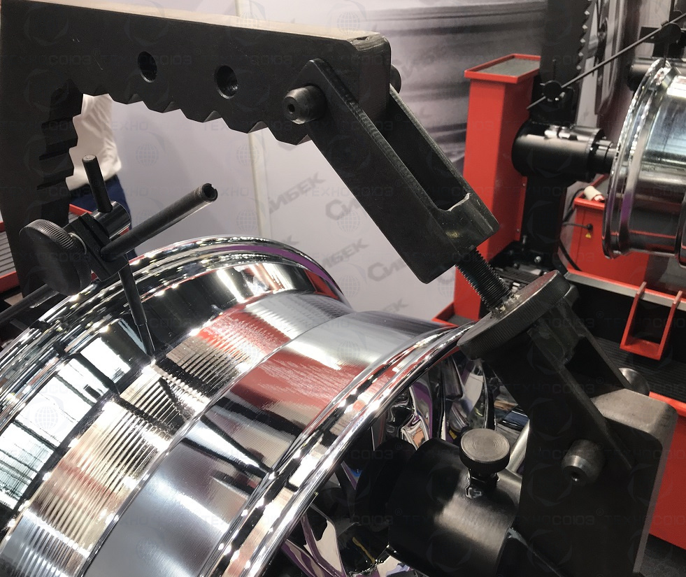 Обновленный дископравный стенд получил специальную конструкцию – мост с навесным оборудованием, устанавливаемый на место классических упоров. При этом на мост устанавливаются свои, специальные упоры, полностью замещающие старые и расширяющие возможности ремонта колесных дисков. Также на мост установлен винтовой упор, необходимый для правки сложных повреждений и повреждений типа «восьмерка», и специальный двухсторонний гидроцилиндр с захватом. Конструкция гидроцилиндра позволяет фиксировать его в любом положении и производить правку диска одной рукой, без удержания гидроцилиндра на весу.