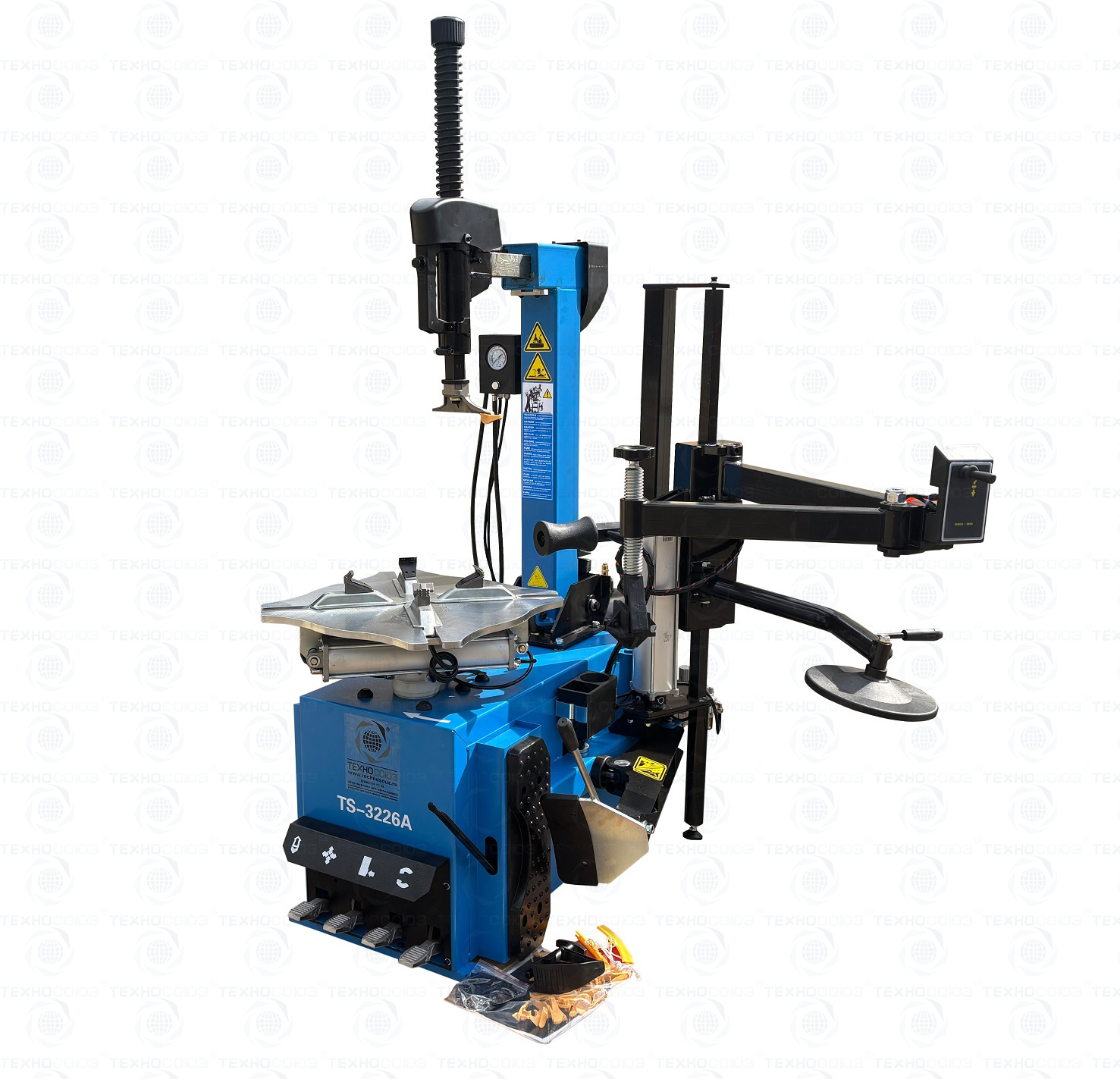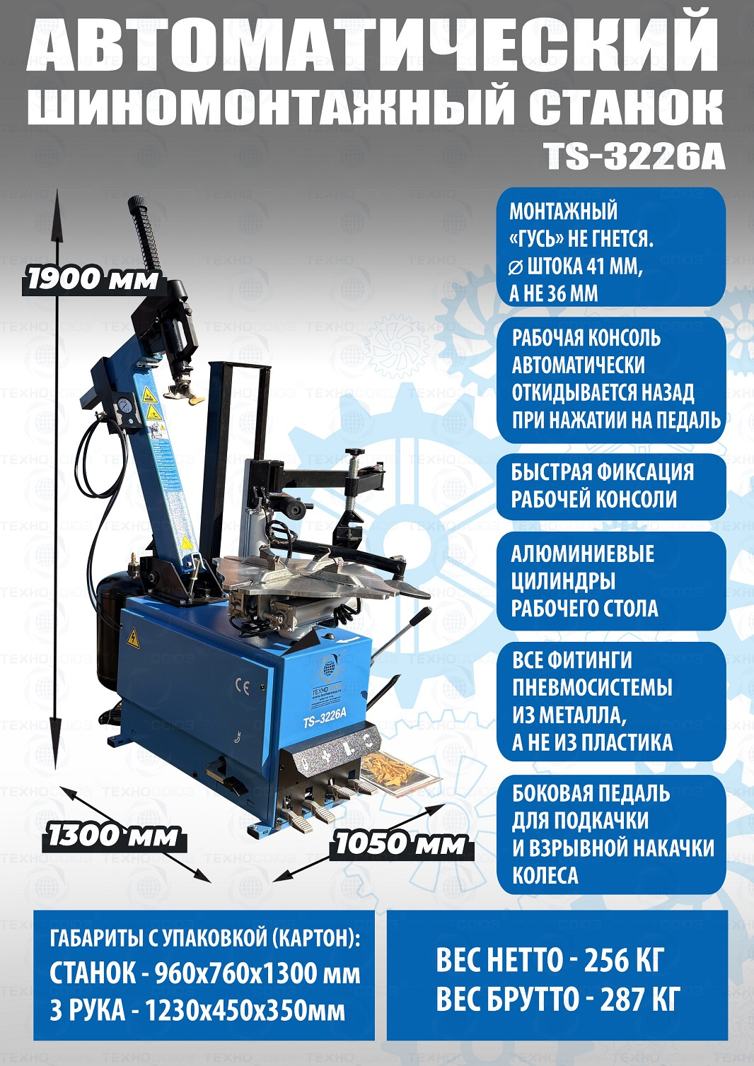 автоматического шиномонтажного станка TS-3226А предназначен для монтажа и демонтажа колес легковых автомобилей, легких грузовиков, не больших автобусов и коммерческой техники. Для дисков: 11÷24”. В комплекте: полноценная 3-я рука для работы с жесткой и низкопрофильной резиной RUNFLAT. + встроенный бустер  24 литра (взрывная подкачка) + пистолет для подкачки шин + монтажка + регулятор давления с влагоотделителем и манометром.