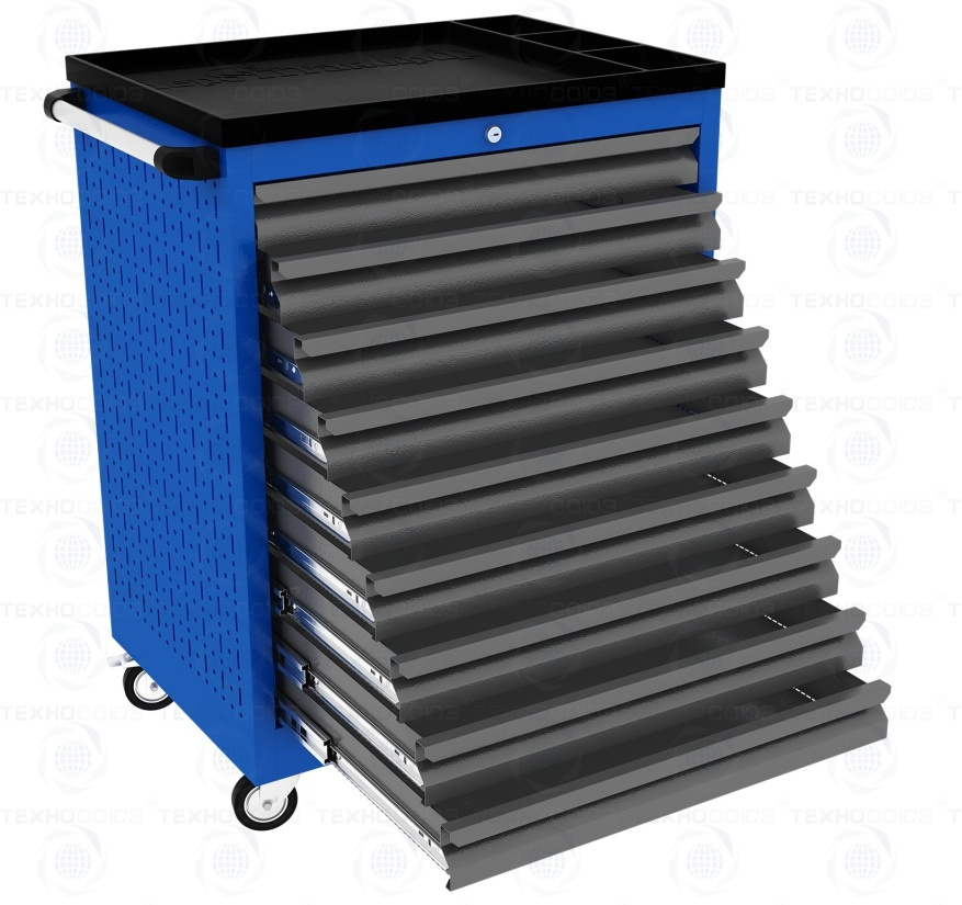 Тележки инструментальные серии PROFFI 950 предназначены для использования на предприятиях любого профиля занятых ремонтом и изготовлением различной продукции. На боковые стенки инструментальной тележки нанесена перфорация размером 25х25 мм и диаметром отверстия 8 мм, что позволяет устанавливать на них навесной инструмент или крючки. Наибольшей популярностью тележки инструментальные пользуются в сфере авторемонта и обслуживания автомобилей .Тележки имеют выдвижные ящики на шариковых телескопических направляющих полного выдвижения с фиксацией в закрытом положении, предотвращающее открывание при передвижении тележки. Ящики имеют центральный замок, который позволяет ограничить доступ посторонних лиц к содержимому ящиков. Тележка инструментальная изготовлена из высококачественного металла ведущих Российских производителей, покрашена порошковой краской производства Германии, имеет итальянскую и турецкую фурнитуру. Тележки для инструмента оснащены двумя не поворотными колесами диаметром 100 мм, одним поворотным и одним поворотным со стопором, которое фиксирует тележку и предотвращает непроизвольное скатывание.