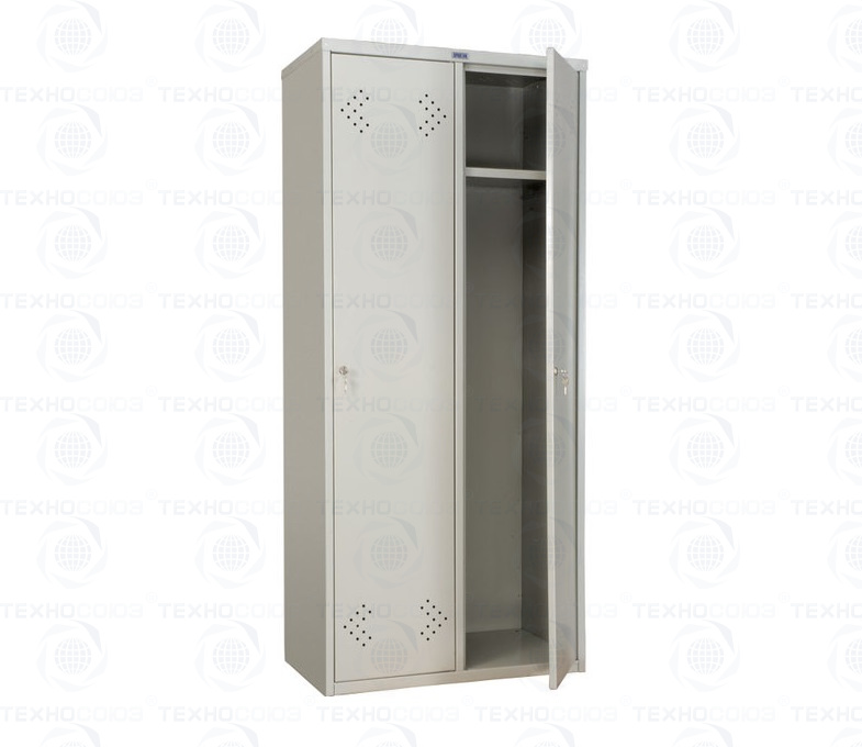 Металлический шкаф для раздевалки Практик LS-21-80 (широкий). Имеет две двери, замки ключевые, полка для головного убора, труба для плечиков, крючки, вентиляционные