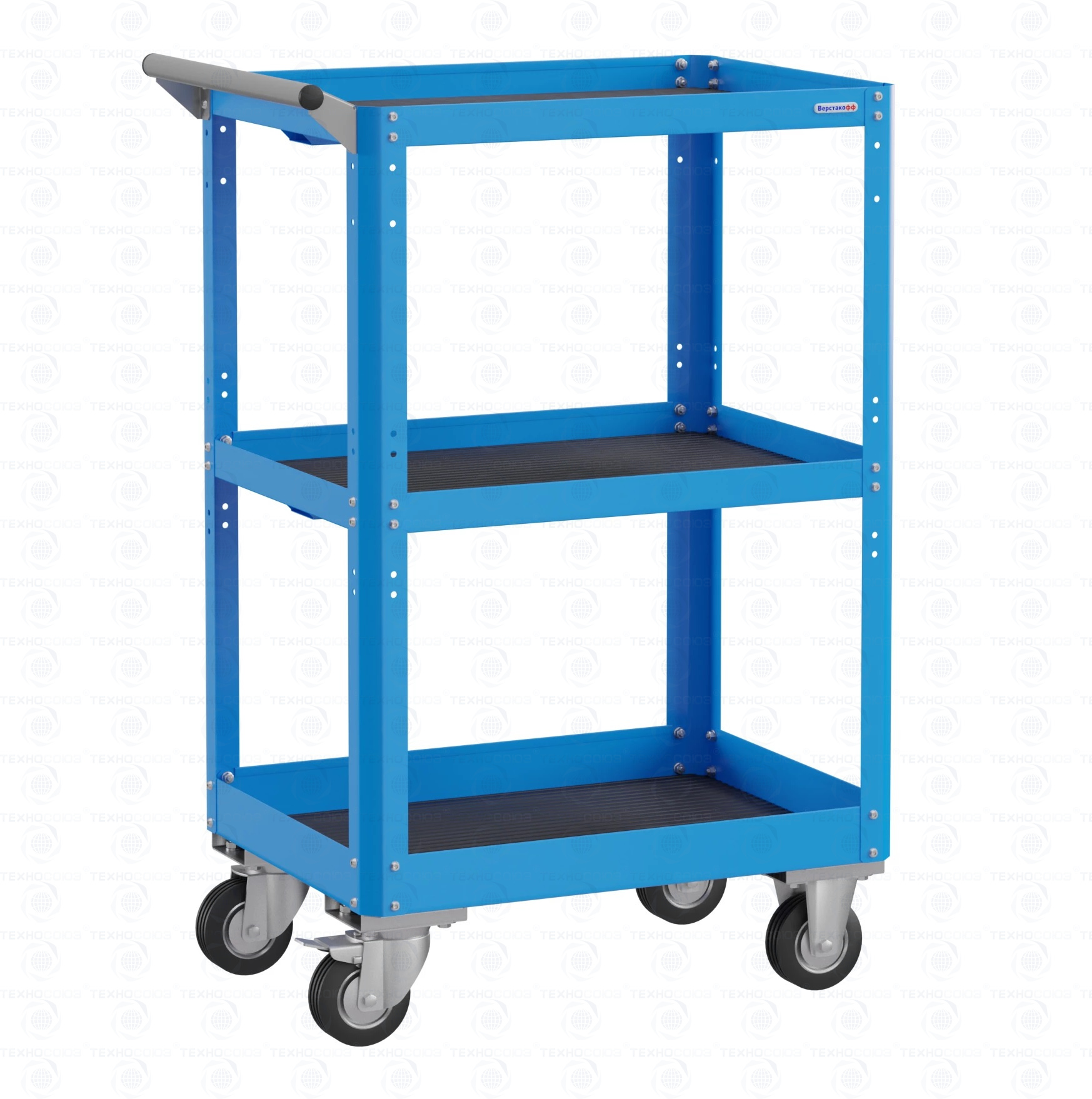 Корпус выполнен из листовой стали толщиной от 0,6 до 1,5 мм., покрыт полимерной порошковой краской. Комплект резиновых ковриков. Общая равномерно-распределённая нагрузка на тележку - до 100 кг. Верхняя и средняя полка имеют высоту борта 40 мм., нижняя полка имеет высоту борта 60 мм. Размер 950х600х450 мм.