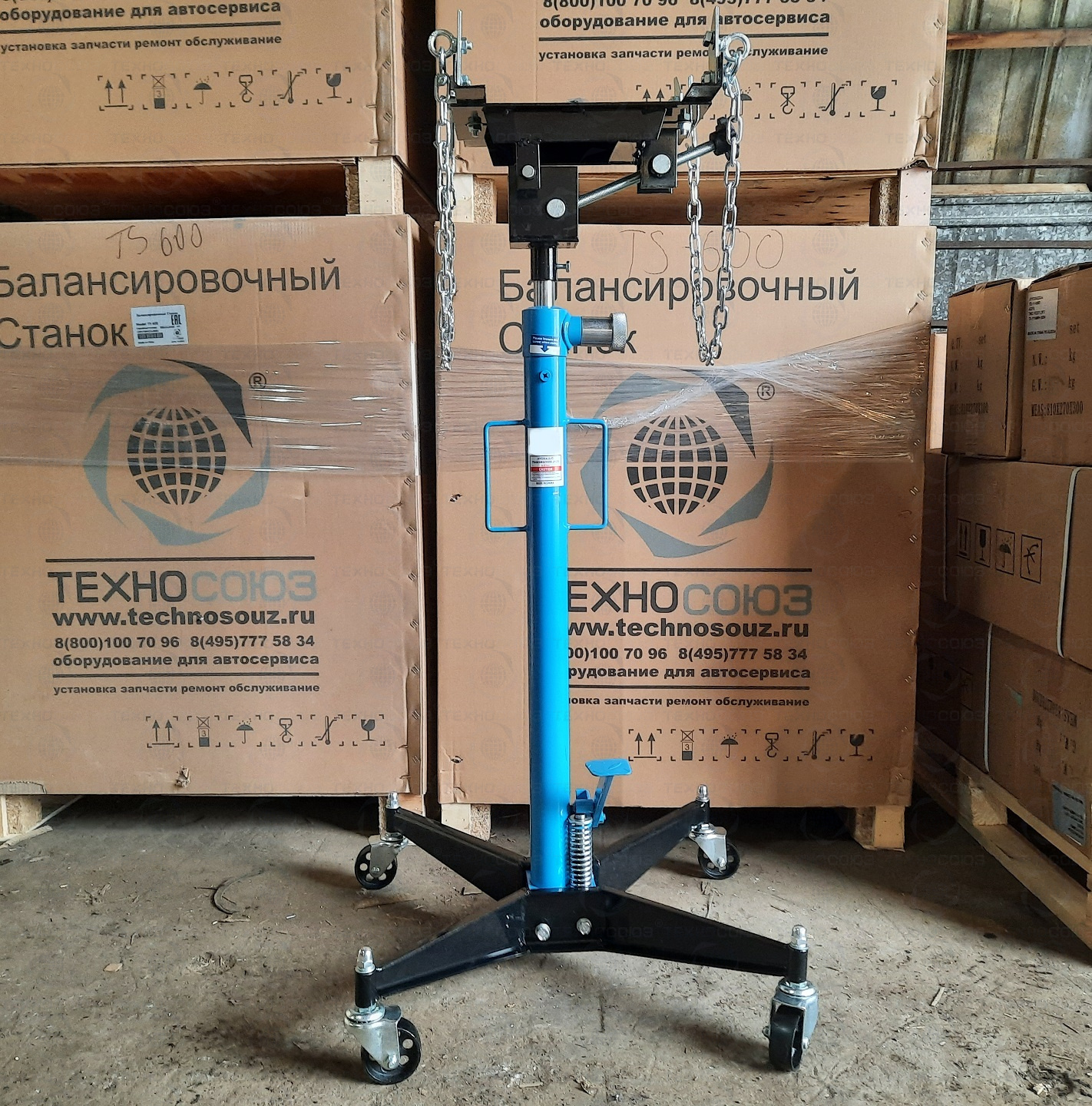 Гидравлическая. Профессиональная. Оборудована страховочной цепью, для предотвращения падения агрегата. Регулировка в 3 плоскостях: продольно, по наклону, по оси вращения и фиксацией в 2 плоскостях. Применяется при монтаже и демонтаже узлов трансмиссий, тормозных суппортов и других агрегатов автомобиля, или технического обслуживания. Стойка трансмиссионная является мобильным подъемным механизмом. Диаметр штока 30 мм.  г/п 500 кг. Подъём 1200÷2040 мм.