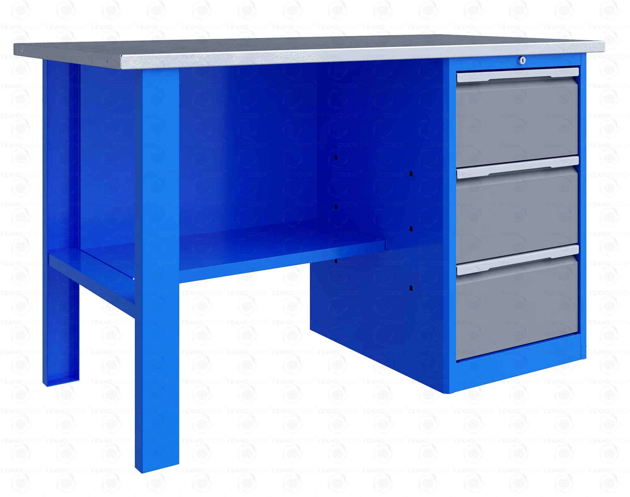 Тумба верстака -сварная. Ящики в тумбе устанавливаются на шариковых телескопических направляющих полного выдвижения. В тумбе P3 установлено три больших ящика. Внутренние размеры больших ящиков (ВхШхГ), не более: 222 х 397 х 520 мм. Тумбы с ящиками снабжены общим центральным замком с поворотом ригеля 180 градусов и подпружиненной тягой. В комплекте два ключа.